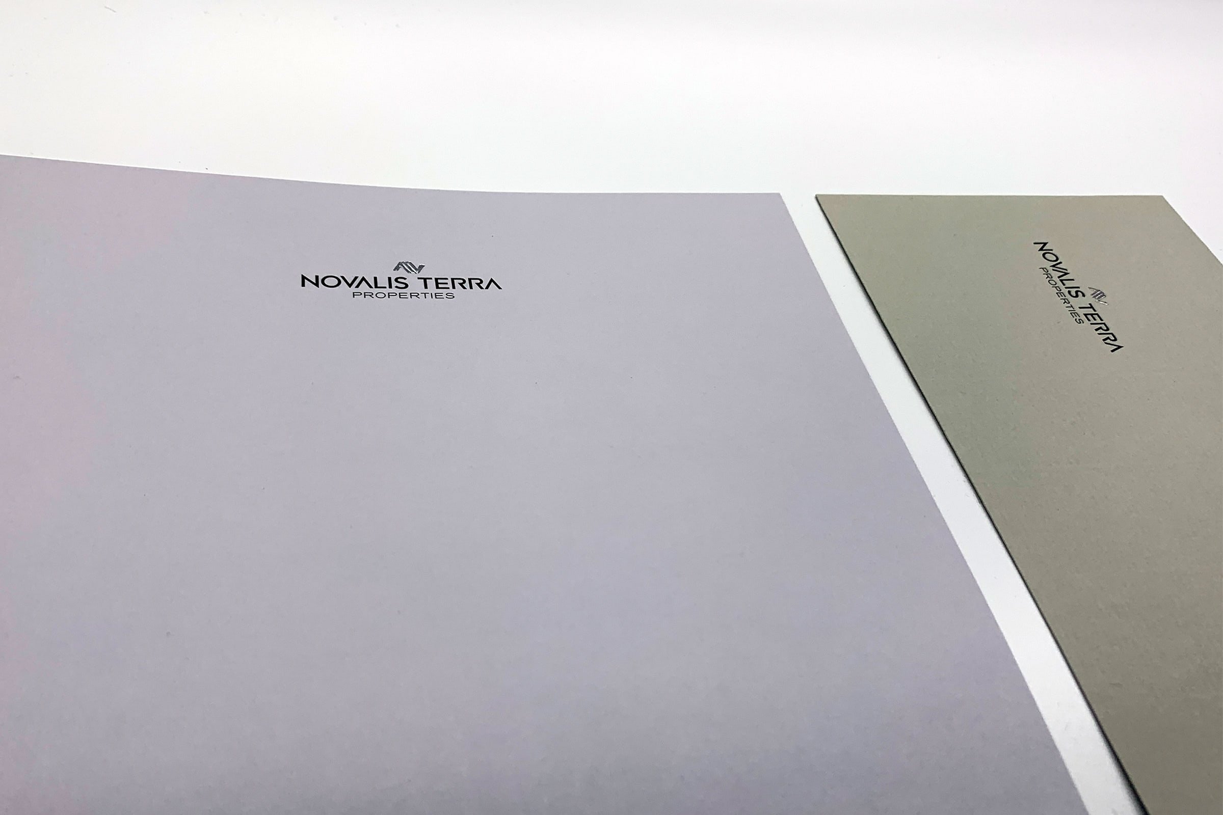 Papers: Conqueror Laid High White 300gr. for the folder and 400gr. for the business cards. Conqueror Laid Feather 120gr. for the letterhead. Conqueror Laid concrete grey 120gr. for the Dl envelopes and finally Conqueror Laid pencil for the with compliments card.