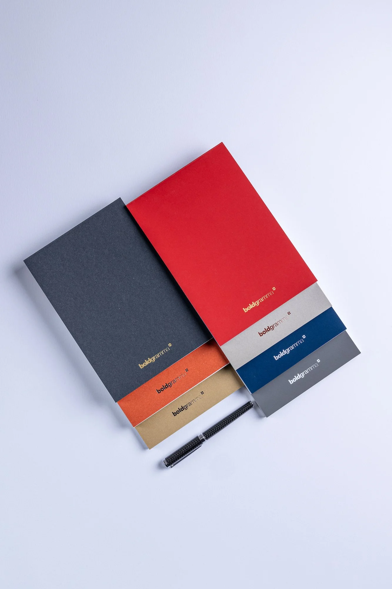 Upgrade your note-taking with our premium bespoke notepads, available in portrait or unique cheque book-style landscape sizes. Choose between plain or ruled layouts, with exceptional paper quality and luxurious cover options. Add sophistication with foil-printed covers, making your notepad both practical and stylish. Perfect for jotting ideas, staying organised, or elevating your stationery collection, our notepads blend functionality with elegance.